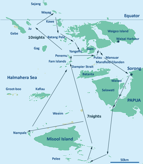 10泊以上のスケジュールが多いラジャアンパットクルーズだがパールオブパプアは7泊8日のスケジュールでも南部のミソールまでカバーしている。