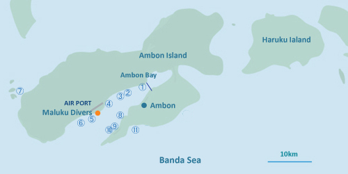アンボン ダイビング:AMBON DIVING INFORMATIONアンボンはコーラルトライアングルの中心部に位置するセラム島の南西にある東西約40km 南北20km程の島で古くからスパイスの交易で栄えていました。インドネシアの首都ジャカルタの北東3200kmの距離にあり、マルク洲の洲都となっています。ダイビングポイントが点在するアンボン島の南西部のアンボン湾は空港のすぐ南のエリアで2次交通の必要はほとんどありません。レンベと並んで欧米人に人気のマックダイブの聖地といわれています。 湾内は砂地のマックダイブサイトで、赤、黄色、紫のいろいろな色のボロカサゴやハナイカ、ボブテイルスクイード、ヘアリーフロッグフィッシュ、アンボンスコーピオンフィッシュ等の奇種珍種に出会えます。透明度の良い外洋はソフトコーラルも豊富で沈船やスイムスルーなどの複雑な地形があります。また回遊魚やマンボウなどの大物とも出会える可能性もあります。アンボンは2つの顔を持った、バラエティーに富んだ秘境スポットです。