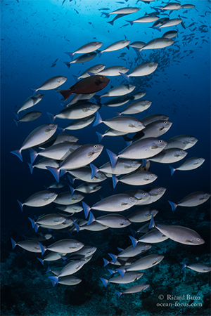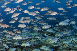 トップは水深5mのシーマウント。流れは速いがイソマグロ、サワラ、バラクーダ、ロウニンアジ、多様なサメが回ってくる。