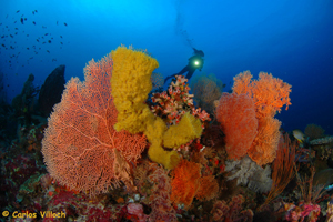 パンタール島側のウォールでカラフルなソフトコーラルが群生している。カスミアジ、スイートリップス、グルクン等、多様な回遊魚が通りすぎていく。