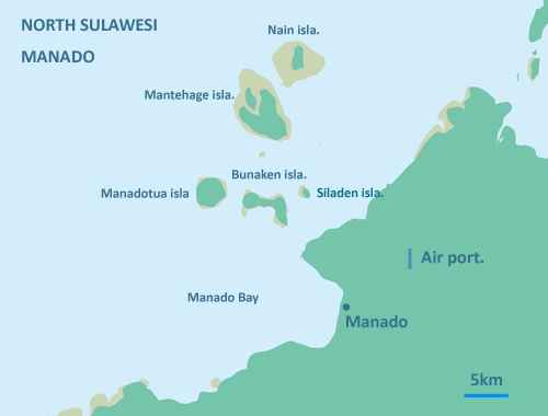 メナドはインドネシアの中央部、赤道直下に位置するスラウェシ島の最北端の西海岸のリゾートです。沖のブナケン島のエリアは 数百メートル級のダイナミックなドロップオフに生育した色とりどりのサンゴを背景にバラエティに富んだ生物が暮らしています。 年間を通して海のコンディションがよく、よい時には30メートルを越える透明度を誇ります。多様なダイビングポイントが点在し、バンガイカーディナルフィッシュ(レンベエリア)をはじめとしたメナド固有種の魚やピグミーシーホース等のマクロ生物、バラクーダやカスミアジ等の群れまで、多種多様な生物を楽しむことができます。巨大なカメが見ものです。