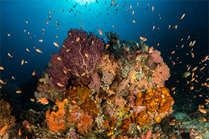 テルナテ ハルマヘラ島:Ternate & Halmahera レンベの対岸のハルマヘラ島の東部のリゾート。島の最高峰は1715mの標高の活火山のガマラマ山で1538年から70回以上噴火している。手つかずのテーブルサンゴやソフトコーラルが広がっている。複雑な島々に囲まれた地形に数多くのポイントが存在する。透明度は20mから40m。エビ、カニ等の小物からブラックチップチップシャークやバラクーダの群れまで盛り沢山。