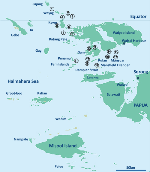 ラジャアンパットの海域は50,000㎦にも及び日本でいうとい九州から屋久島までの海域に相当し、複雑な島々の合間を縫う海流により他に比べようの無い多様な生態系が存在しています。1度の訪問ではとても回りきれないほどのポイントがあり15泊のクルーズまで設定されています。