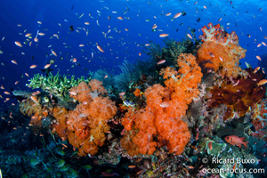 Misool Island, also known as South Raja Ampat, is the southeastern portion of a myriad of islands with a complex limestone crust topography. The wide expanse of water, with its complex island and reef formations, is home to numerous islets, rocks, reefs, and hidden roots, and is dotted with countless dive sites. The waters on the eastern side of Misool Island are also recommended for divers who like topography, as the terrain is complex. The eastern side of Misool Island has a unique topography with a series of sheer monolithic walls. The water is also covered with beautiful soft corals, canyons, and pinnacles. Gorgonian sea fans over 3 meters in diameter grow in clusters, and corals of unparalleled beauty and color thrive here.