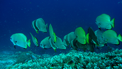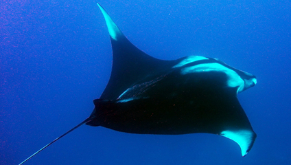 Blue Magic : Batfish and Redcoat / Oceanic Manta ( Mobula birostris )
