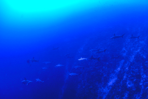 ハンマーヘッドはじめ、イソマグロ・ギンガメアジ・カンムリブダイ・ホワイトチップ・モブラの群れが回ってきます。