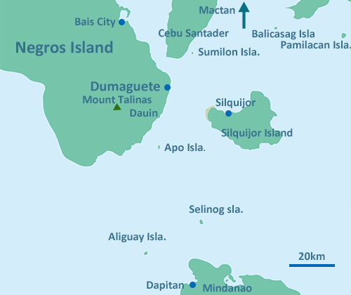 ドゥマゲッティへのアクセスはマニラから国内線で1時間強。空港から中心部のダウンタウンまでは車で20分ほどと近い。主なダイビングポイントはドゥマゲッティの南のダーウィン周辺に点在する。