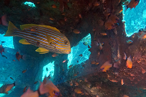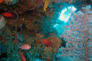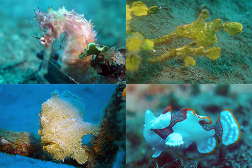 アポ島のビーチ前のサンクチュアリというポイントでが一面のスタッグホーンコーラルを住みかとするスズメダイやパープルビューティの群れやアオウミガメやツバメウオが、オーバーハングの下にはヒメジやミナミハタンポの群れが見られる。モヨウフグやネズミフグとサンゴのコンビネーションも。西側のマムサというポイントではコーラルスロープ上を徘徊するギンガメアジの群れやバラクーダの群れとも遭遇可能。他にも、マダラトビエイ、オオモンカエルアンコウ、クマドリカエルアンコウ、コブシメなどが見られる。