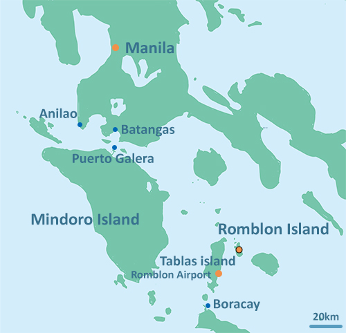 ◇フィリピンの首都マニラからSWIFT AIR が火曜、木曜、土曜の週三便ロンブロンの西のタブラス島に飛んでます。1時間のフライト後、空港から車で1時間でタブラス島の東部の港サンオーガスチンに着きます。そこから船で30分程でロンブロン島にたどりつきます。