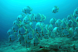 チャーターベースで行く、サバンビーチの北東のヴェルデ島の周囲はサンゴに覆われたウォールが広がり、ツバメウオやフエダイの群れやリーフシャークが回ってくる。