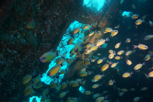 サバンビーチからビーチエントリー可能な大小3つの小さな沈船。船の中を通り抜けると中にはRing -Tailed Cardinal(アオスジテンジクダイ)が群れている。回りの砂地はナイトダイビングでカニ、エビ、タコ、ミシマオコゼ、ホウボウ、ウミテングなどと遭遇可能。