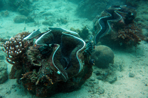 コーラルリーフの下の砂地のマックダイビングポイント。大きなシャコガイ砂地にいくつも生息している。タツノオトシゴやカエルアンコウがいる。ブルーリングオクトパスがいることも。