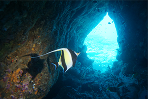 オーバーハング状の地形や大きなコーラルパッチが広がる。
