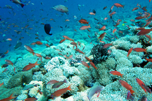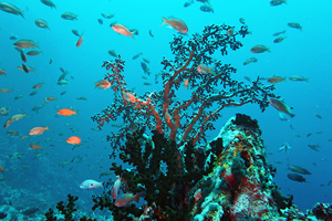 ソフトコーラルに覆われた流の早いスロープをドリフトで潜る。浅場のリーフのサンゴは美しく、コーラルパッチの下には多くのミノカサゴが休んでいる。カスミアジ等のアジ類が回ってくる。