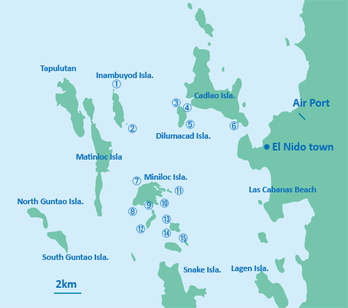 Helicopter Beachマニラから飛行機で南東に飛行機で1時間ほどの石灰岩質の島々で複雑な地形が広がっている。空港はプライベート運営なのできれいで独特の雰囲気がある。マニラ空港のタームナル4から出るエルニド行きの Swift Air の荷物制限は20kgのためBCDやレギュレーターはレンタルがお勧め。