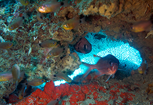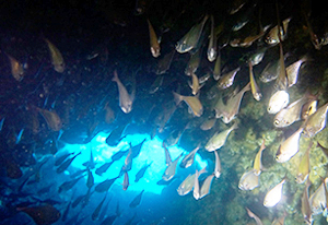 通り抜けられるトンネルがある。光が差し込む穴にはハタンボの群れが。