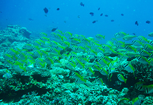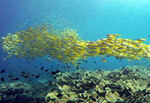 キャベジコーラルの上を無数のイエロースナッパーが徘徊している。フグ、ダツ、ウツボ、など200種類の魚が見られる。