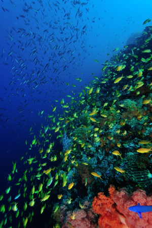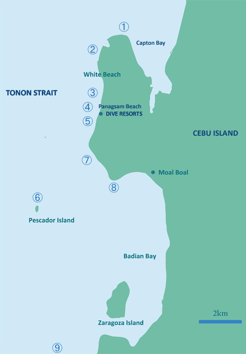 Moalboal has long been a favorite dive destination for Western divers, and the coral in front of the resort area is exceptionally beautiful. and the drop-off beyond it is home to many green sea turtles. Along the coastline where this drop-off is located, branching corals and cabbage corals are surrounded by schools of colorful fish such as Purple Beauties and Melanesian Anthias. Another unique feature is the myriad of sardines that inhabit the house reef. Pescador Island, about 15 minutes offshore by boat, has a beautiful cave called Cathedral.