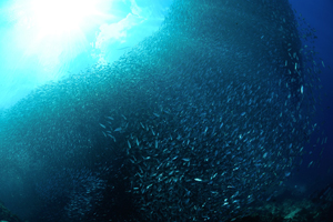 ドロップオフになっており、マイワシの群れにアジの群れやオキサヨリ大型の回遊魚がイワシをハンティングする様が見れます。