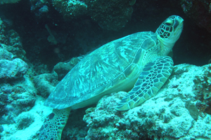 アオウミガメも棚でよく休んでいて間近で見れる。ジンベエザメの目撃例も多い。