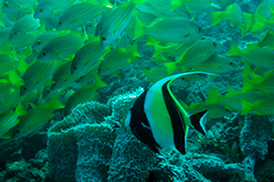 ディリの沖合25kmに浮かぶアタウロ島はワイドのポイントでバラクーダやカツオの群れが徘徊している。